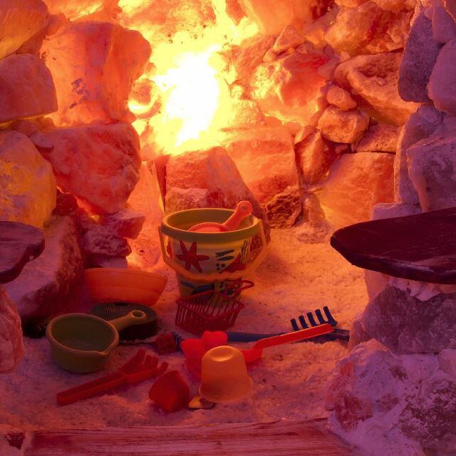 Für die Kleinen haben wir an drei Tagen in der Woche eine 45-minütige Sitzung vorgesehen. In Begleitung eines Erwachsenen dürfen die Kinder mit dem von uns gestellten Sandspielzeug im Salz spielen.